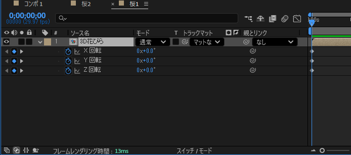 回転させるには回転の項目にキーフレームを打つだけでOKです。今回は立体的に回転させるのでX、Y、Zすべての方向に1回転させます。